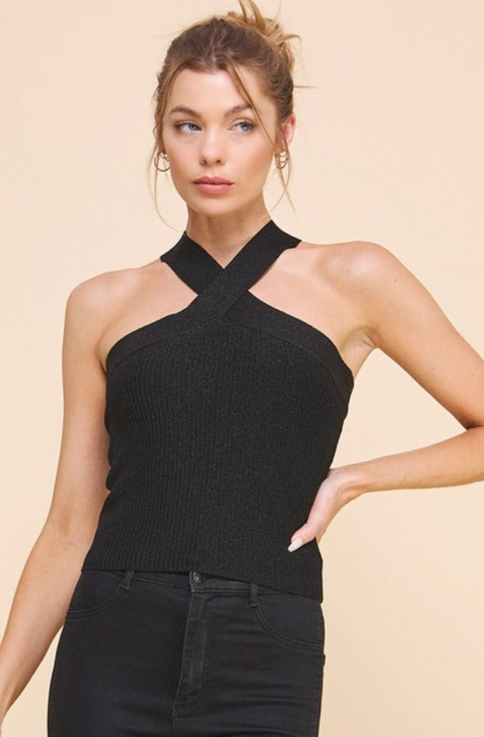 Look sharp in the Cross My Heart Ribbed Top: a twist halter top with striking black ribbed details. Steal the show with its glint of lurex and feel confident it'll stay put--you'll never have to worry about it slipping out of place! (And you'll look great doing it!)