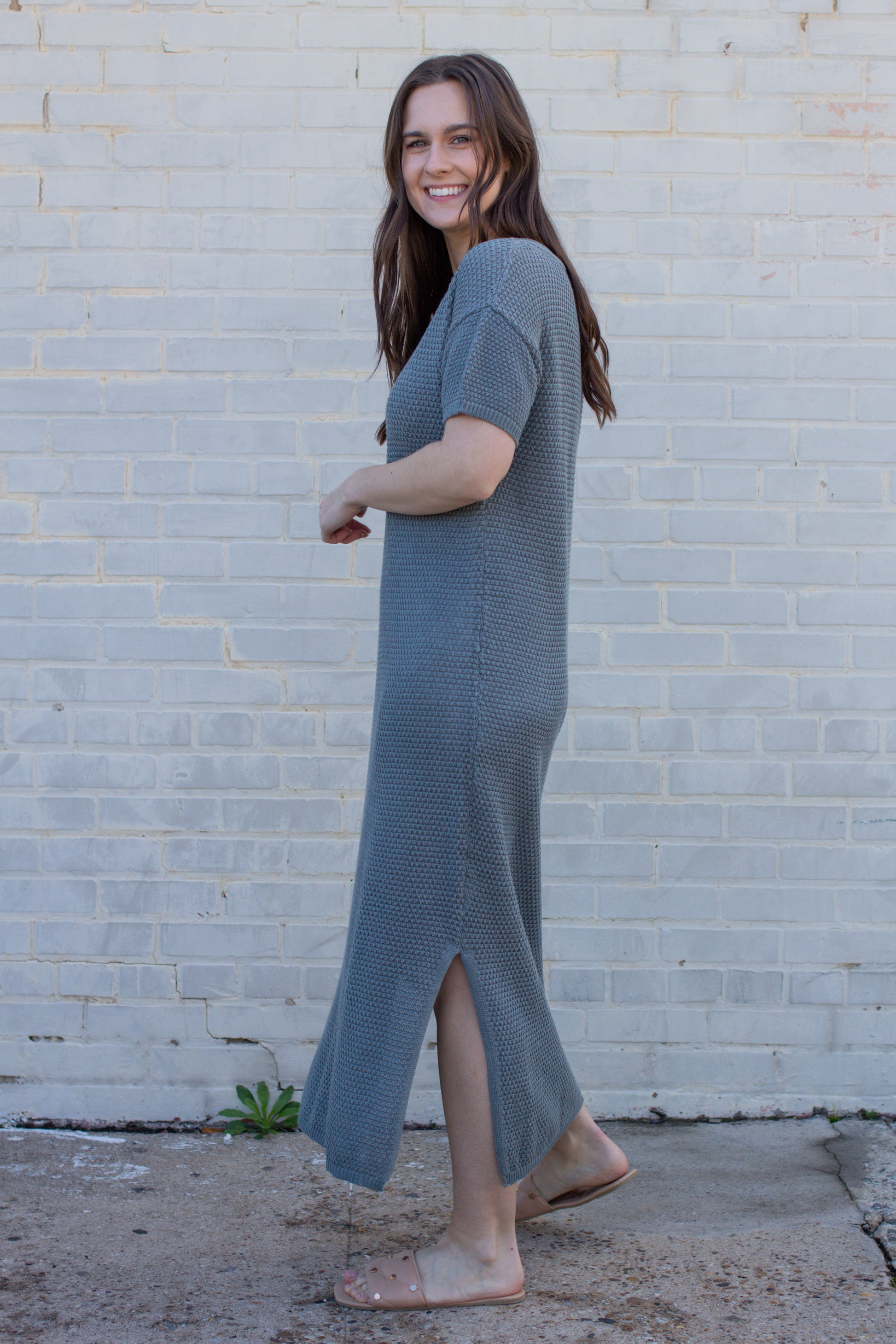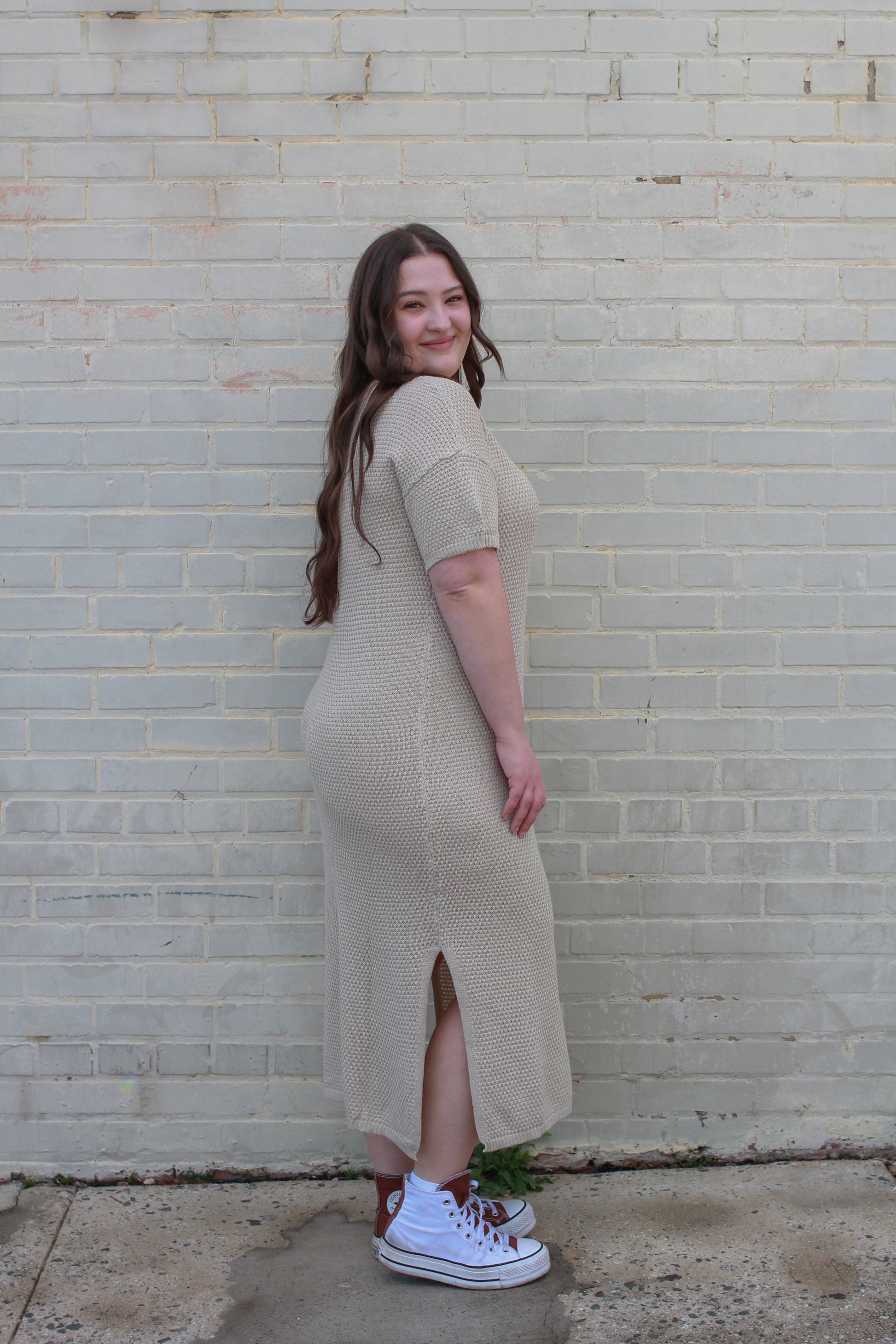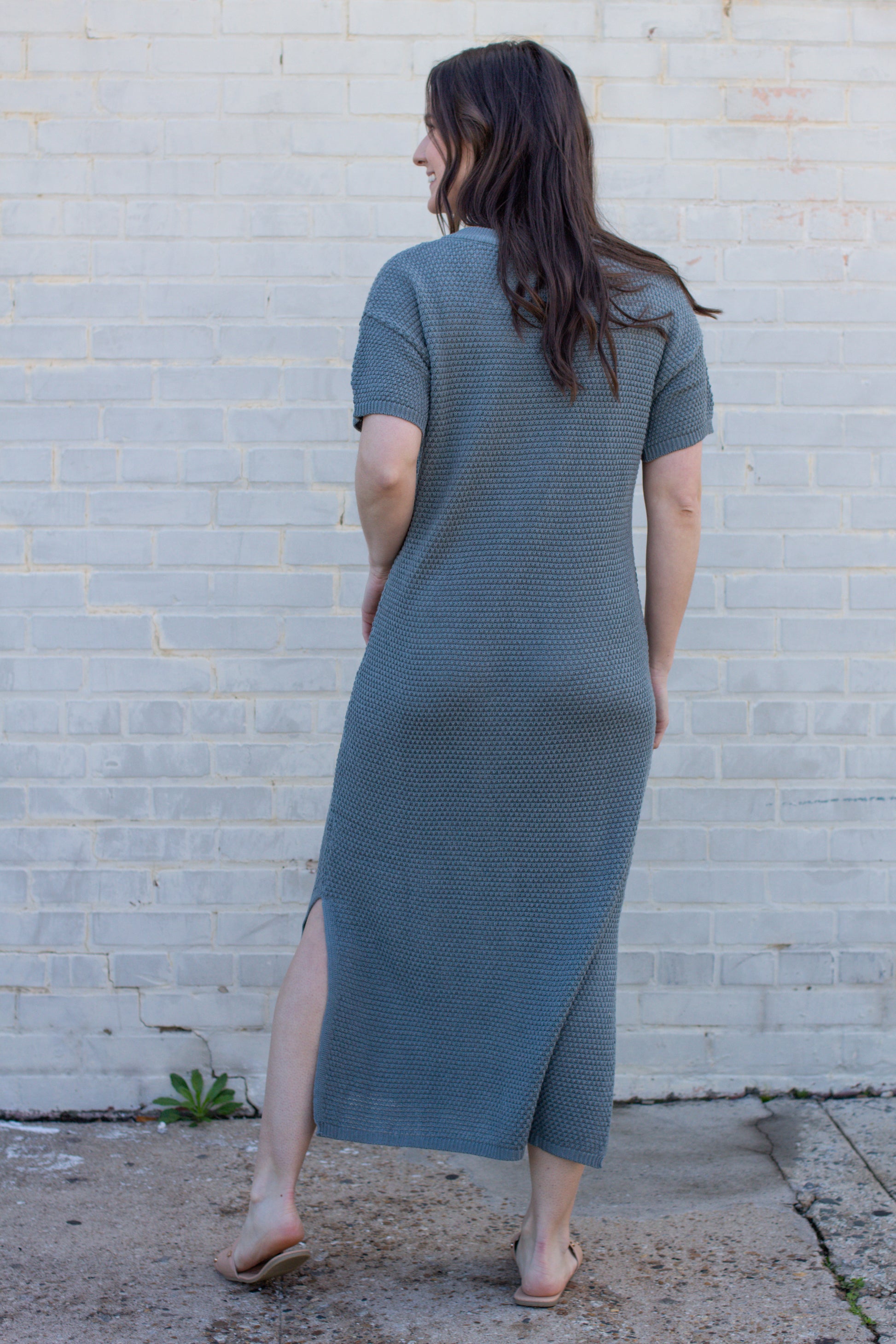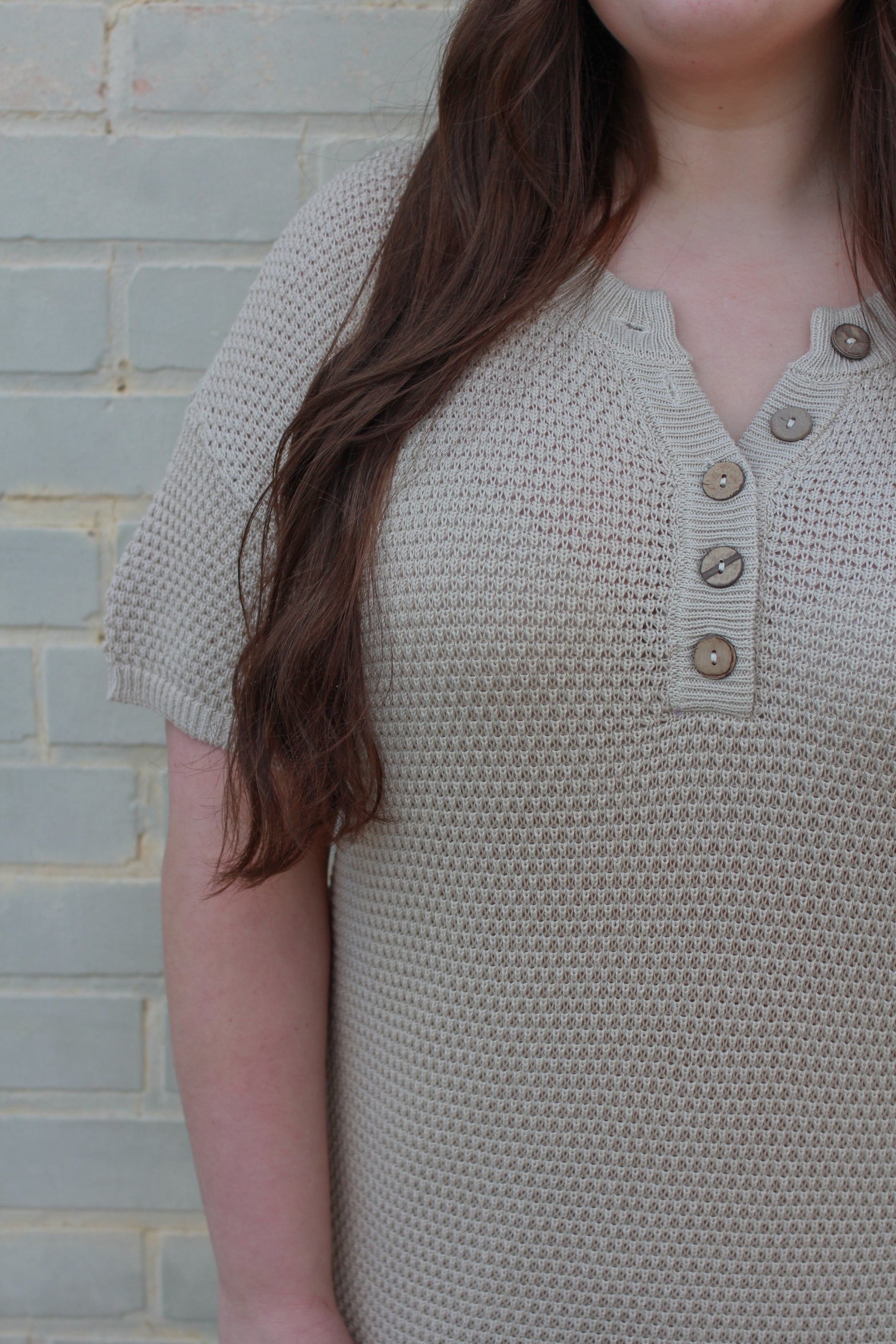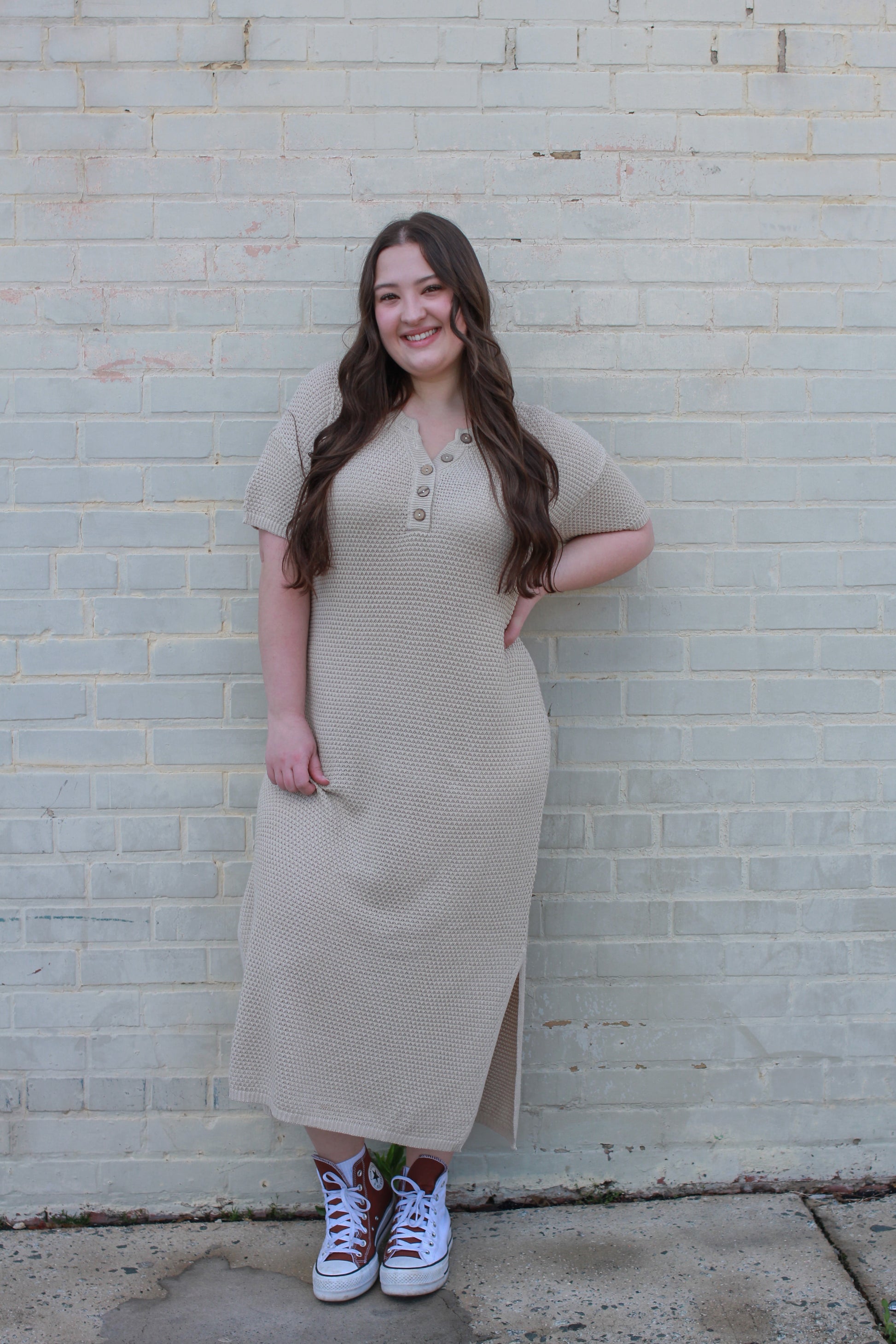 Meet your new favorite dress! With a playful design featuring non-functional buttons and side slits, this dress is both cute and cozy. Perfect for any occasion, you'll be turning heads and staying stylish. And with its versatile length and comfortable fit, you won't want to take it off! (But, unfortunately, you'll have to sometimes).
